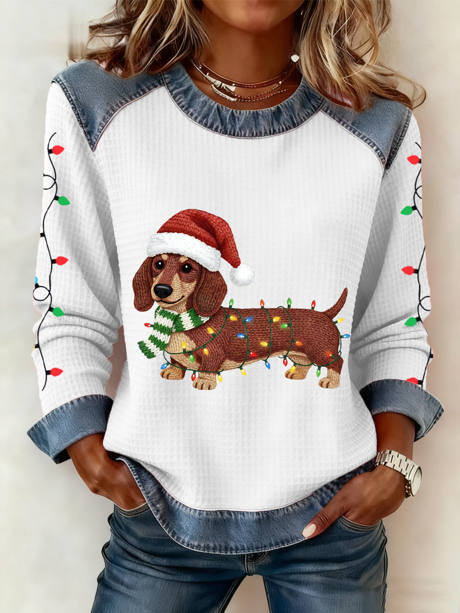 Damskie lampki bożonarodzeniowe Jamnik z nadrukiem Casual Denim Patchwork Top