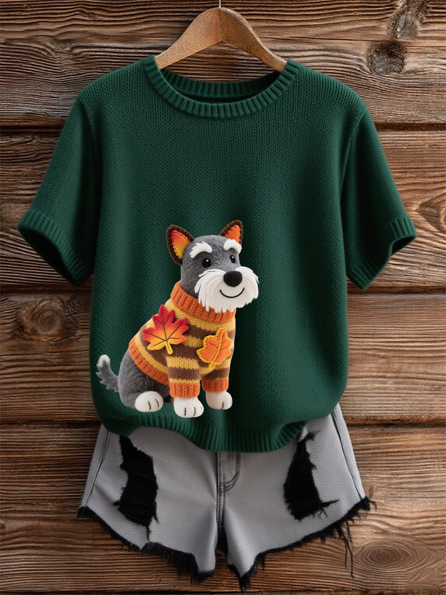 Damska koszulka z krótkim rękawem w stylu jesiennego psa z nadrukiem pod szyją