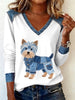 Damski jeansowy patchwork art Yorkshire terrier pies wzór dekolt w serek z długim rękawem T-Shirt