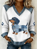 Damski uroczy jamnik z denimowym patchworkiem artystycznym z dekoltem w szpic