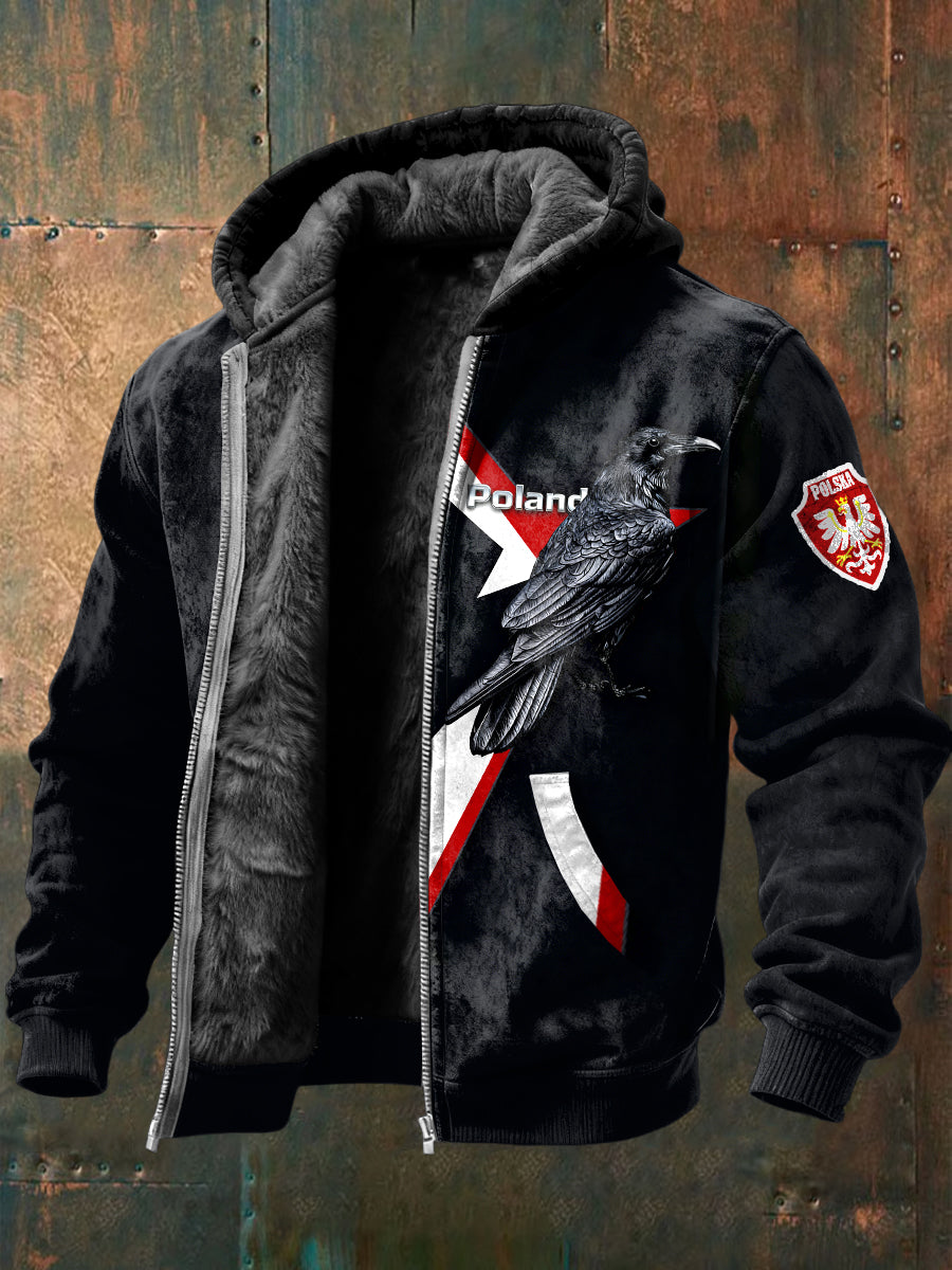 Męska flaga Polska Raven Print Czarna kurtka z polarową podszewką