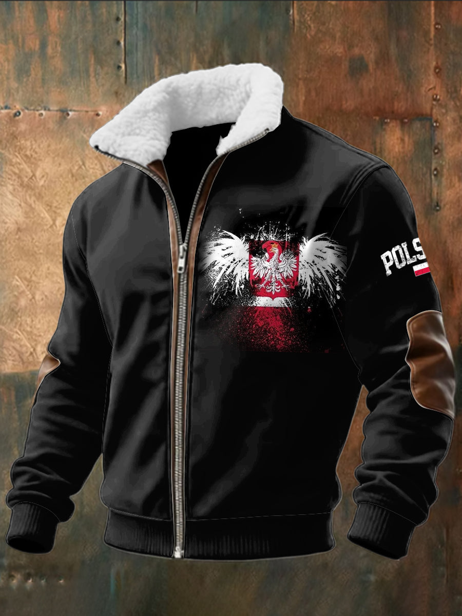 Retro Abstrakcyjny Polski Orzeł Lambskin Patchwork Zipper Kurtka