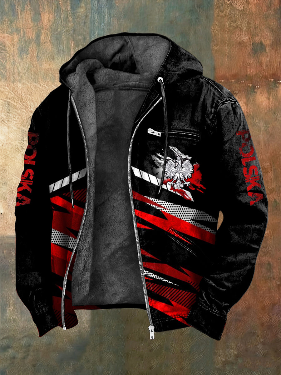 Retro Polski Orzeł Geometryczna kurtka z kapturem z polarem