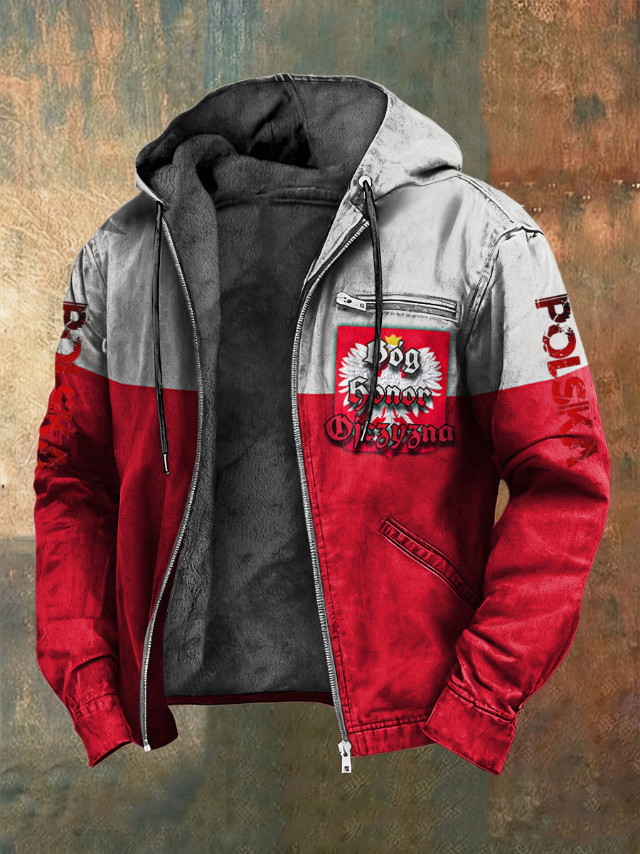 Retro polski orzeł patchworkowy polarowy płaszcz z kapturem